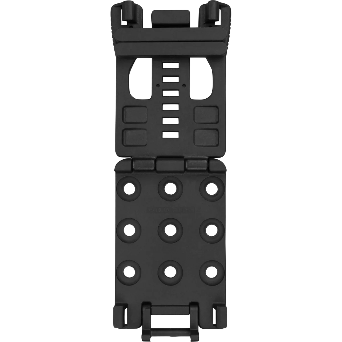 • The hinged two-piece Tek-Lok frame is locked into place with two release tabs and unlocked by pressing both release tabs toward each other