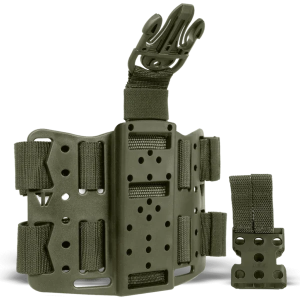 Not all Thigh Rigs are created equal. The Blade-Tech Thigh Rig features a swivel loop buckle and industrial strength VELCRO® strap system that allows for a full range of motion without compromising stability or adding unnecessary, bulky material to your rig. The Thigh Rig allows you to have a stable platform for attaching Blade-Tech holsters and attachments. Rubber is woven directly into the fabric of the inner facing thigh straps to eliminate unwanted shifting and maximize comfort. The buckle attachment is designed for compatibility with our TMMS (Tactical Modular Mount System) making every inch of real estate on this rig incredibly useful for carrying a variety of Blade-Tech gear. The mounting plate of the Thigh Rig is enhanced with a lot of mountings options. Located at different distances from each other to make sure you can attach almost anything. From a knife sheath to the holster of an airsoft weapon. The Blade-Tech Thigh Rig comes with a bag filled with the buckles for the nylon straps and a set of screws in different lengths. What's Included 1x Thigh Plate 1x Drop Strap with Swivel Clip 2x Tri Clip 2x Male Squeeze Clip 2x Thigh Strap with Female Buckle 5x 7/6" Truss Head Screws 2x 0.25" Rubber Spacers 3x 3/8" Posts 2x 5/8" Posts