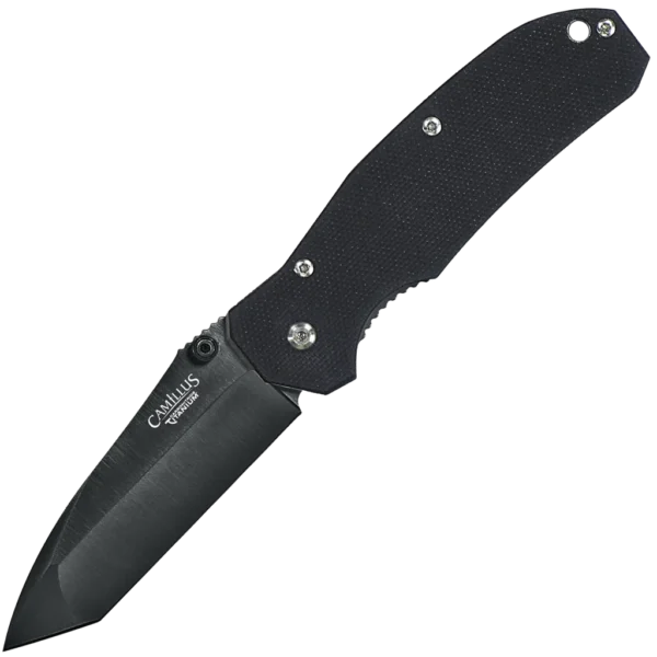 6.75'' Carbonitride Titanium® Folding Knife with G10 Handle VG-10 Japanese Steel / Carbonitride Titanium won't flake, blister, chip or peel and is up to 3x harder than untreated steel so the blades stay sharper, longer. This Camillus 6.75" Folder features a modified tanto style blade, and textured G10 scales sit atop the steel liner lock frame. Tip-down carry pocket clip.