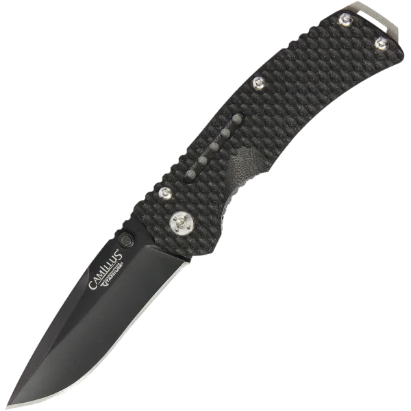 Camillus VORTEX 8" Folding Knife with a 3.25" Carbonitride Titanium Non Stick Blade made from AUS-8 Steel. AUS-8 offers exceptional balance between toughness, edge sharpness, and corrosion resistance. The steel is bonded with Carbonitride Titanium that resists rust and corrosion and is up to 10x harder than untreated steel so the blade stays sharper, longer. Featuring: Dual Thumbstuds, Black G-10 Handle, Liner Lock and a Lanyard Hole. Handle includes pocket clip.