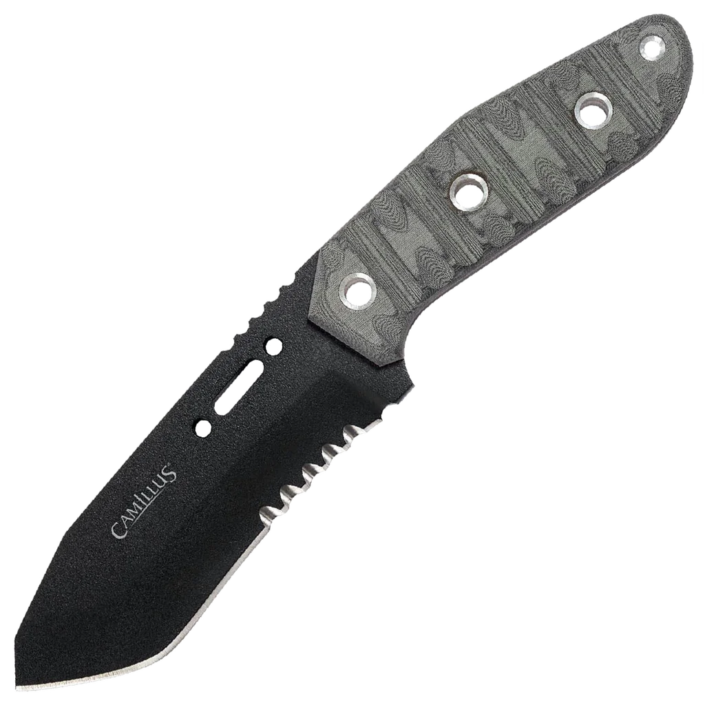 The Camillus CK-9.5 Fixed Blade Knife features a 4.75" blade made from high quality, strong 1095 High Carbon Steel finished with a black traction coating. The handle is made of Micarta which is extremely resistant to water, cold, heat, rot or corrosion, making it the perfect material for knife handles. Included with the CK-9.5 are a Ballistic Nylon Sheath and a Survival whistle to ensure whatever adventure you pursue, you're ready.