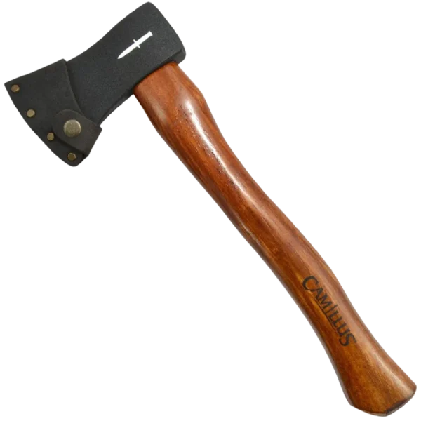 The AMERICAN HICKORY HATCHET by Camillus is a versatile, durable 16-inch hatchet with a hickory handle and leather sheath, designed for a wide range of outdoor and utility tasks. It pairs a compact overall length with a robust forged carbon steel head for reliable chopping and cutting performance in camping, hiking, bushcraft, and general field use. The sharp blade is designed to cut wood efficiently, allowing for precise and effective timber preparation and kindling work. The hatchet features a hand-forged carbon steel head for long-lasting durability and consistent performance. The genuine 14-inch hickory handle offers superior strength, natural shock absorption and a comfortable grip for extended use while reducing user fatigue. Its attractive natural grain also adds to the tool's appearance. Compact and portable, the 16-inch design balances functionality with easy transport, fitting into a backpack, tool kit or camping gear. It is suitable for tasks such as chopping firewood, preparing kindling, clearing brush and light hammering, supported by a balanced weight distribution. A premium leather sheath is included to enhance safety and convenience, securely covering the blade during storage and transport.