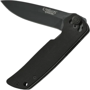 Camillus CUDA Mini 6.75" Folding Knife with a G-10 handle and AUS-8 Steel Blade. G10 handles are impervious to moisture or liquid and physically stable under climate change. AUS-8 offers exceptional balance between toughness, edge sharpness, and corrosion resistance. The steel is bonded with Carbonitride Titanium that resists rust and corrosion and is up to 10x harder than untreated steel so the blade stays sharper, longer. 3" Drop Point Blade. This knife features a Quick Launch Bearing System.