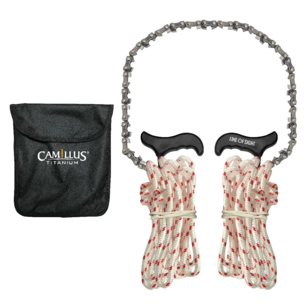 The Camillus Highlimb Branch Saw allows you to clear high branches from the safety of the ground. Its patent-pending weighted-handle design helps you sling the rope over high branches with ease and precision. The dual-direction chainsaw blade cuts in both pulling directions for efficient operation. Two 20 ft sections of 300 lb paracord (40 ft total; 20 ft per side) provide strong, durable connections for demanding jobs. A storage pouch with belt loop is included to store the saw when not in use. Typical applications include installing tree platforms, clearing lines for outdoor activities, storm cleanup, and general property maintenance. Versatile and field-ready, the Highlimb Branch Saw is a useful addition to your toolkit.