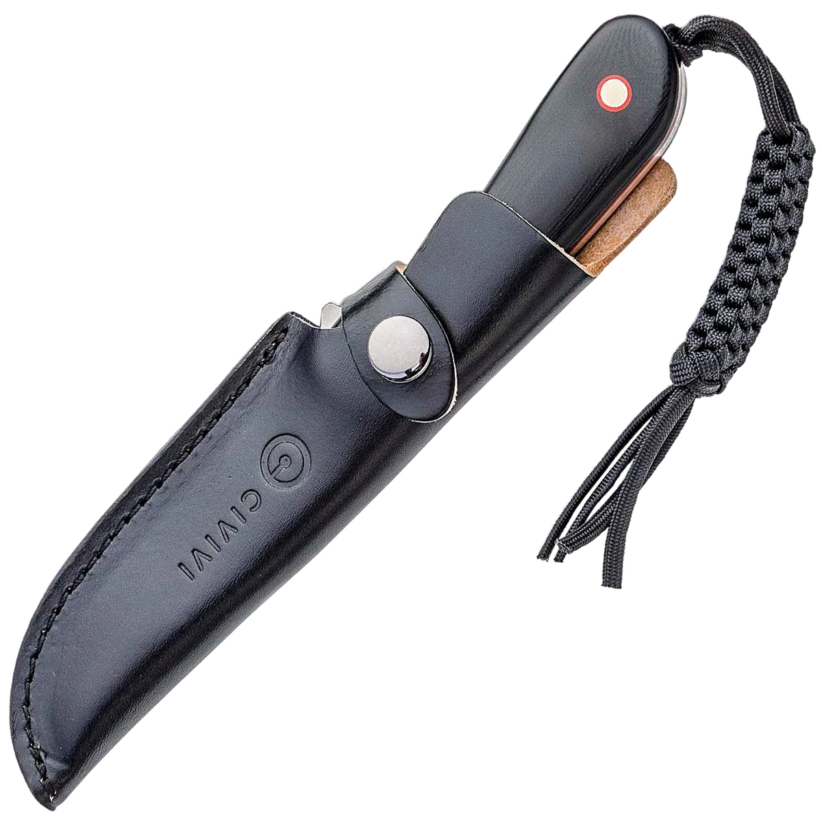 Following the success of the Elementum series of folding knives, Civivi Knife has completed the range with a fixed blade version. The 3.98" drop point blade is made from the popular and proven 10Cr15CoMoV steel, offering a great level of blade retention. For ease of sharpening, the start of the cutting edge begins with a small choil. The full tang construction supports thick, contoured and polished black G10 scales with a simple yet ergonomic design. To facilitate belt carry, a simple black leather button sheath is included, and CIVIVI have pre-attached a paracord lanyard to the knife for added convenience.