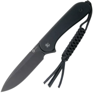 Supremely constructed with a full tang and a black finished drop point blade of D2 steel, this knife is tough and sharpens well. CIVIVI lengthened the blade of this version by a full inch and the handle by a half-inch over the original but kept the classic shape. The flipper tab design is still present in the form of the finger guard and the jimping on the spine provides a great grip. Lightweight and ergonomic, this version features a flat, textured black G10 handle for a sleek, all-black look. The black Kydex sheath includes a Bob Terzuola T-Clip for easy belt carry and CIVIVI's included a tied paracord lanyard pre-attached to the knife.