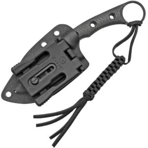 - Compact and easy to carry, this fixed blade comes with a Kydex sheath and a black tied paracord lanyard.