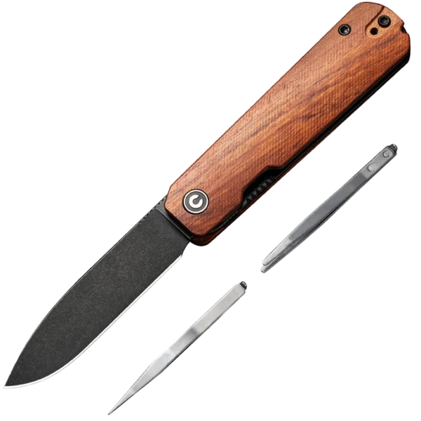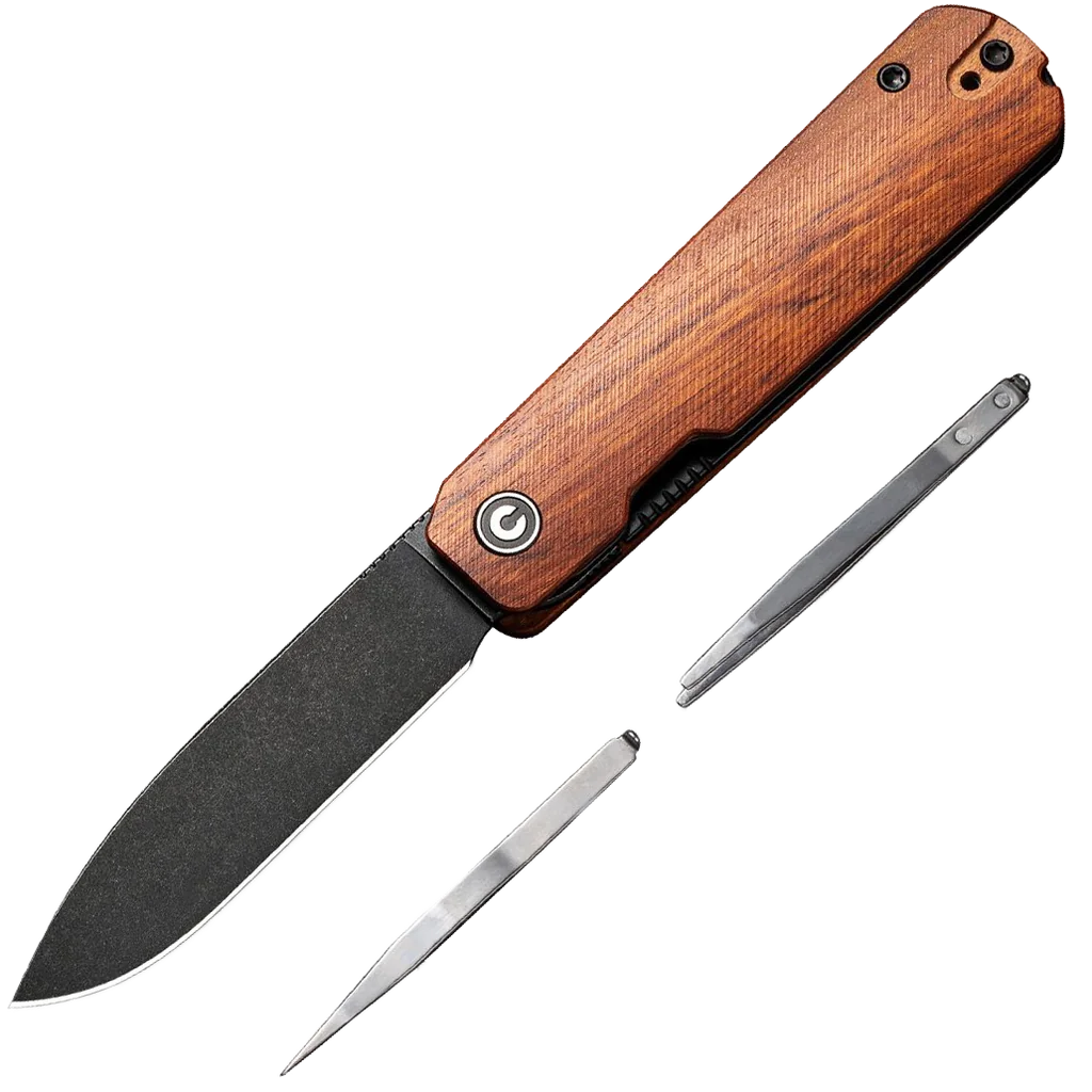 The Ben Petersen designed CIVIVI Sendy is a simple, yet classy liner lock knife that seamlessly conceals tweezers and a metal toothpick. The Nitro-V blade offers a nice blend of toughness and edge retention, and the wood handle makes for a smooth yet tactile gripping material. Both the flipper tab and liner lock are subtle and unobtrusive, but are still easy to operate and function. If your EDC needs require a sleek and slim profile, but with the durability to handle a variety of tasks ranging from household projects to outdoor jobs, the Sendy is for you.