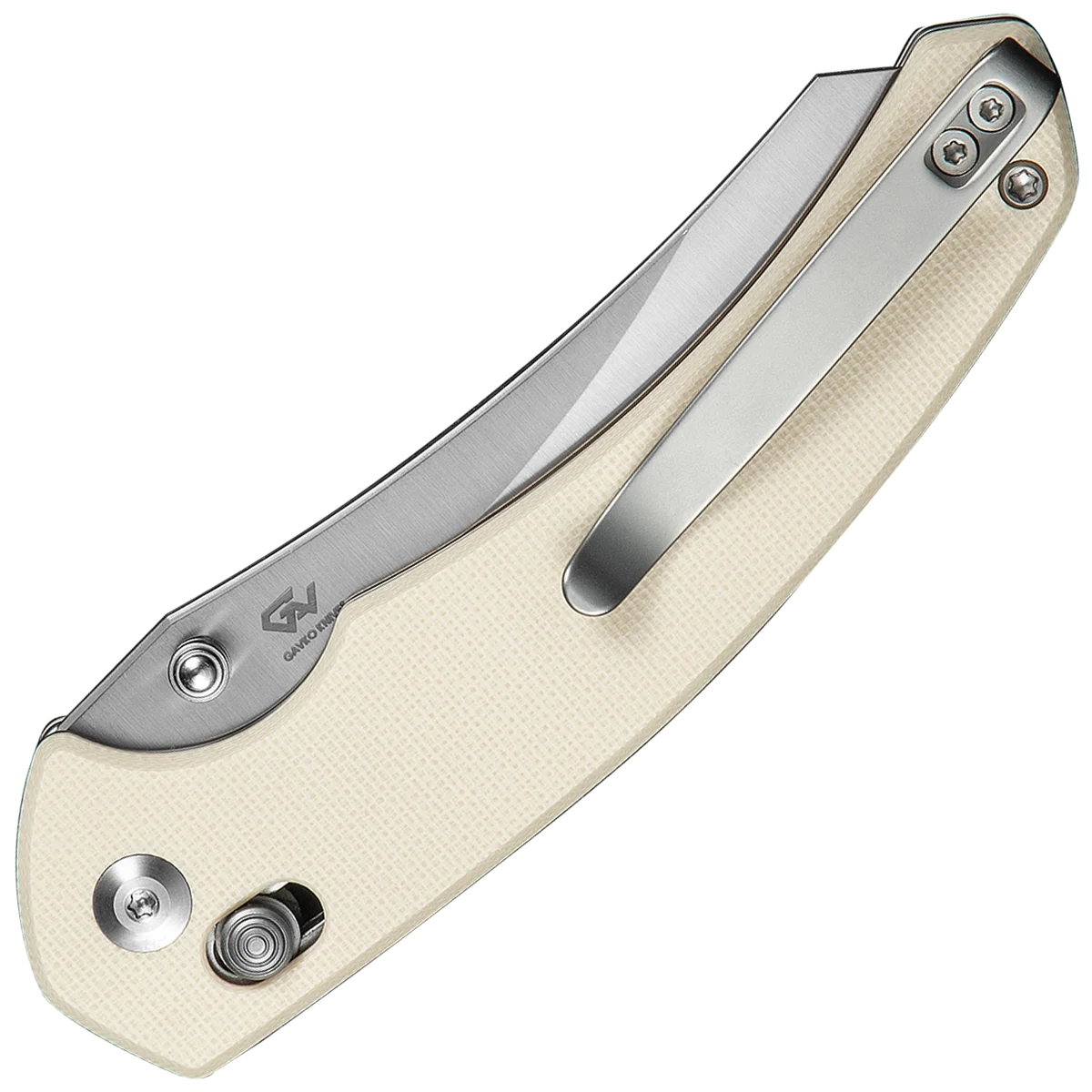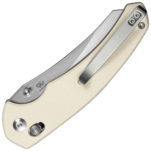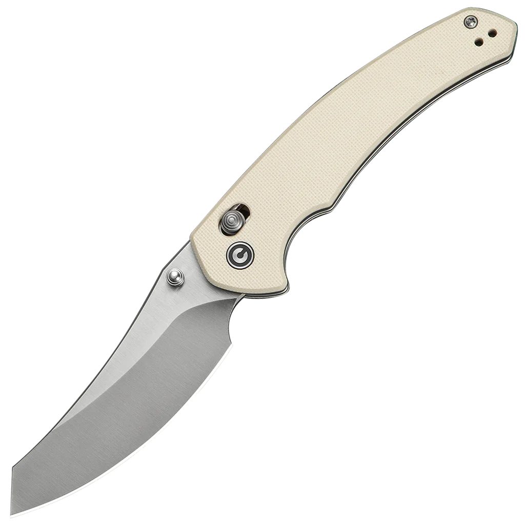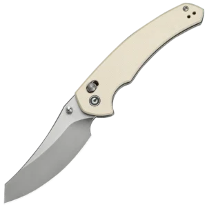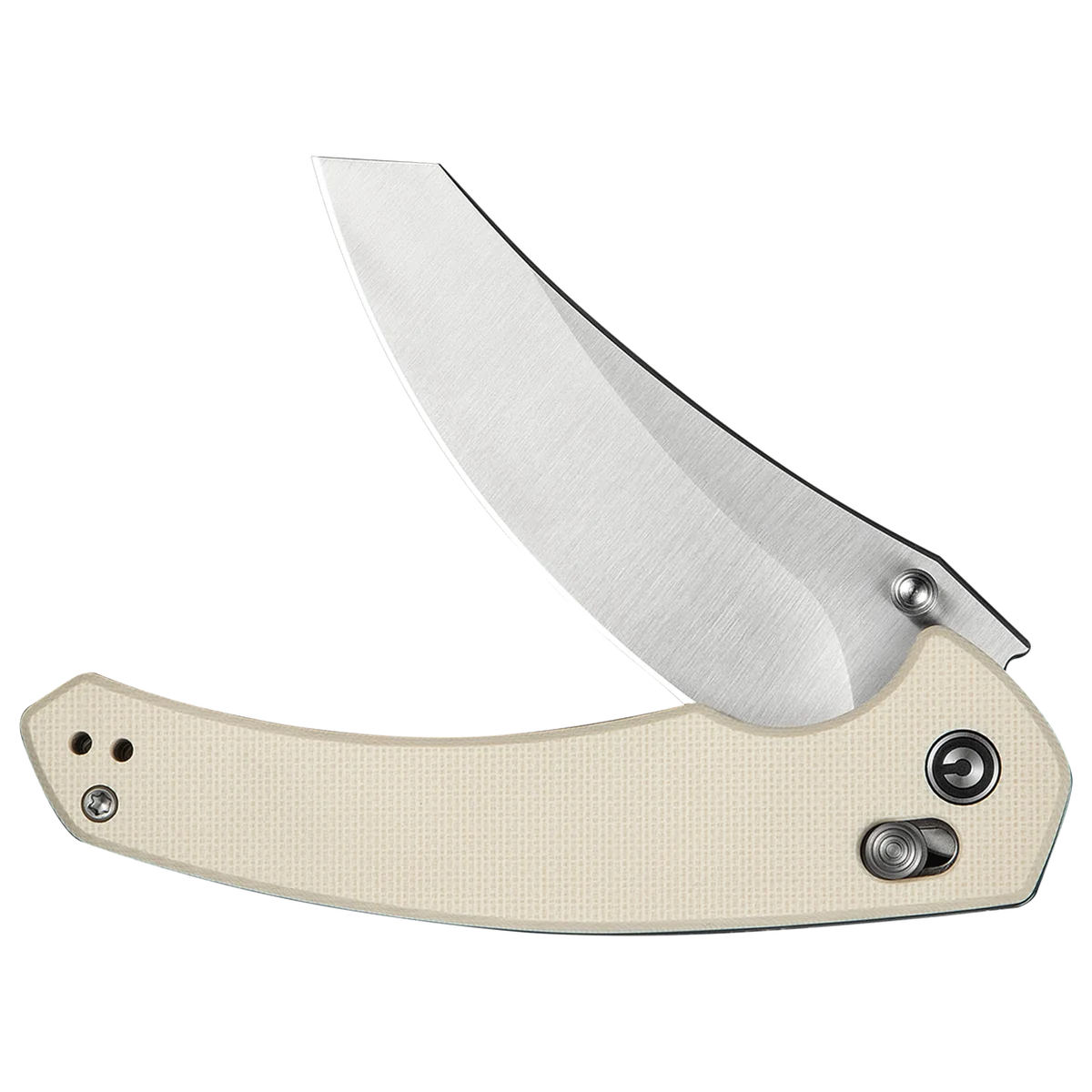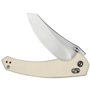The CIVIVI Sixgill Pocket Knife, designed by Gavko Knives, has an Ivory G-10 Handle and a 3.41" Nitro-V Reverse Tanto blade with a Satin finish. It measures 7.78" when opened and is secured with a crossbar lock. The Sixgill utilises a thumb stud opener with a ball bearing pivot for smooth action for easy single-handed use. The stainless steel tip up pocket clip can be mounted on either side of the folding knife for ambidextrous carry.