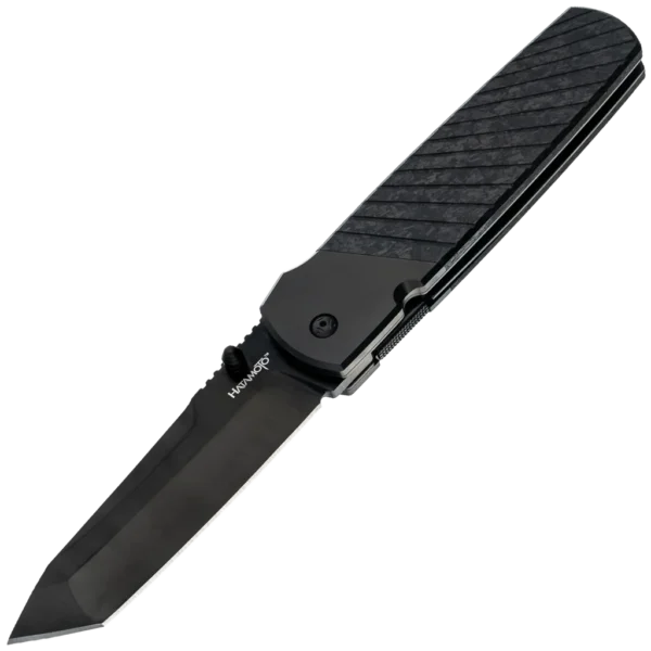 The Cold Steel 60 Series Hatamoto is a streamlined folding knife that’s built to perform. It has a 4" black tanto blade constructed from CPM 20CV steel, with a liner lock and a thumb stud opener. The handle is lightweight yet sturdy black carbon fiber.