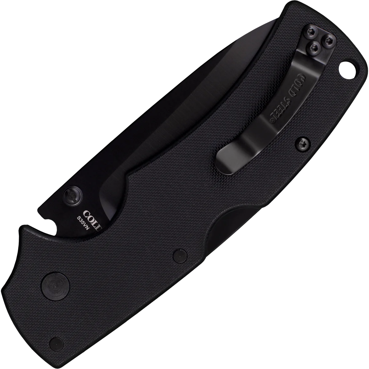 - Folding knife made from S35VN stainless steel with a DLC finish in a drop point style. Black G10 handle with a reversible pocket clip and a lanyard hole! Uses Cold Steel's Tri-Ad locking mechanism.