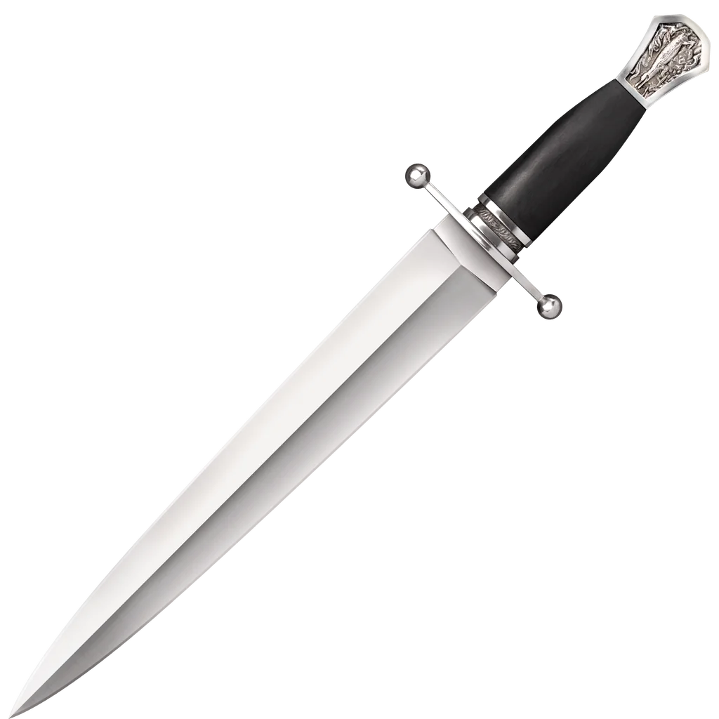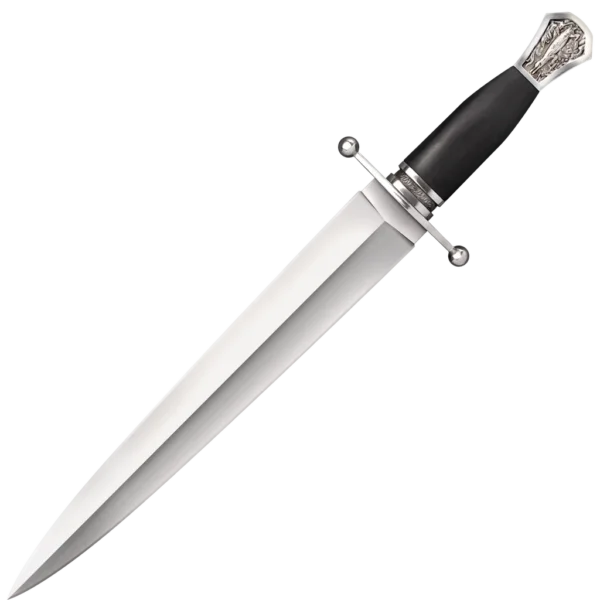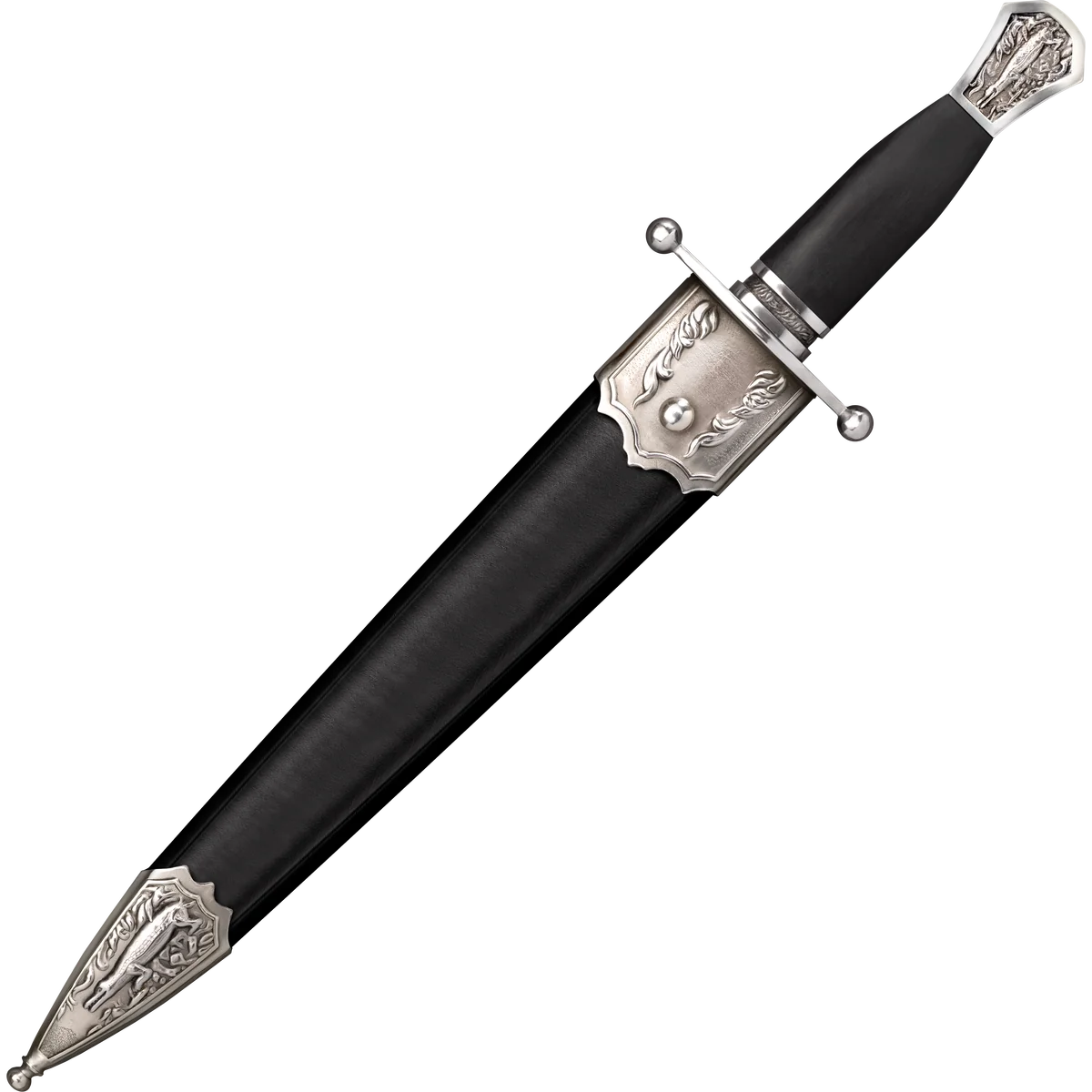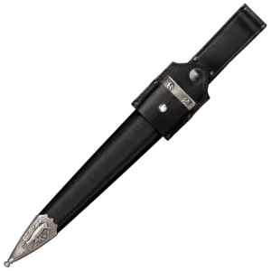 The main competition to the Bowie knife from the late 1830’s to the period just after the Civil War was the Arkansas Toothpick. The Arkansas Toothpick got its namesake as an ironic reference to the coarse, rough and tumble culture that populated the lowlands of Arkansas and the Mississippi delta in the mid 19th century. Travelling journalists from Europe often made up stories about how they commonly saw men and old boys picking their teeth with giant knives that they dubbed Arkansas Toothpicks. Like the Bowie, it was frequently a large knife almost always double edged with a sharp acute point. The knife almost always had a double quillon guard and many were fancy, and some imitated the Bowies of the day in size and appearance. Sure, some were plain, but most were fairly elaborately decorated. Our version has a substantial double edge spear point blade, with a Malaysian Sal wood handle and a fancy pommel with an alligator motif. The scabbard is equally stunning, it’s finely made and decoratively enhanced to complement the handle.
