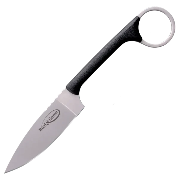 - Cold Steel's Bird & Game full tang fixed knife made from AUS-8A stainless steel, matte finished drop point blade. Black polymer handle with integral finger ring for improved grip! Also includes a Secure-Ex sheath.