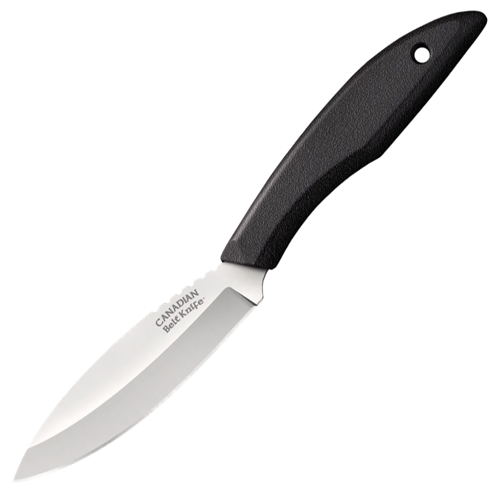 - Cold Steel's "Canadian Belt Knife" full tang fixed knife made from 4116 stainless steel, matte finished drop point blade. Black polypropylene handle with a lanyard hole cut out, also includes a Secure-Ex sheath for transportation.