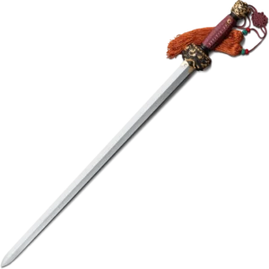 This is a traditional Chinese Gim, that’s styled for the imperial court! It's impressive and stunningly beautiful design is sure to impress even the most jaded aficionado. The blade is fashioned from a fine Damascus steel with a distinctive, and beguiling pattern. It is heat treated to a hard spring temper so that it will resist metal fatigue. The handle has a Rosewood core and is wrapped with silk cord. The guard and pommel are elegantly detailed with a traditional Chinese decorative motif. The scabbard is made from select Rosewood and is decoratively styled to complement the sword's grip.