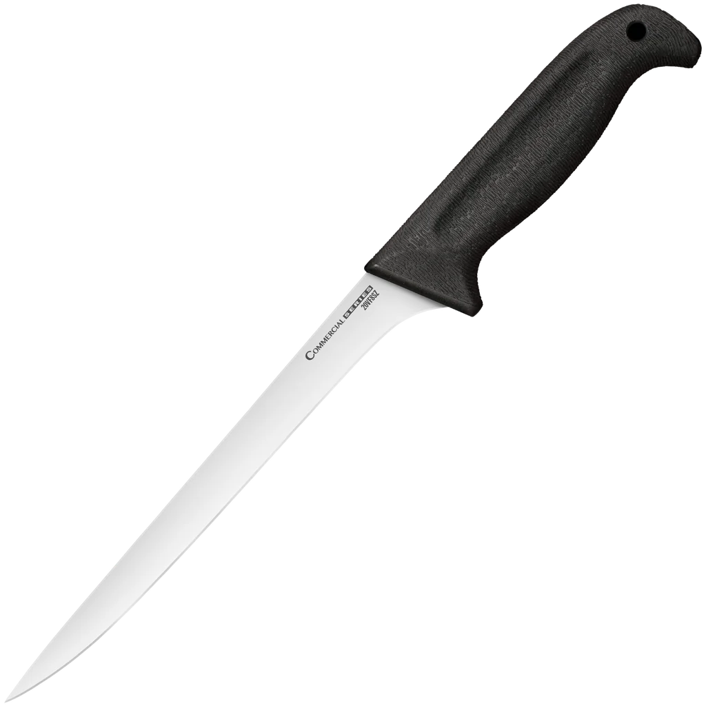 Cold Steel's series of kitchen knives, the Commercial Series, will race through just about any task you can imagine. Theses blades are cryo quenched and then precision flat ground for maximum cutting power. All models in the series come with a razor sharp edge that lasts and lasts. The handles are, in a word, terrific! Carefully designed to ensure a strong, secure, yet comfortable grip, they are made from Kray-Ex for maximum strength without adding unnecessary weight.