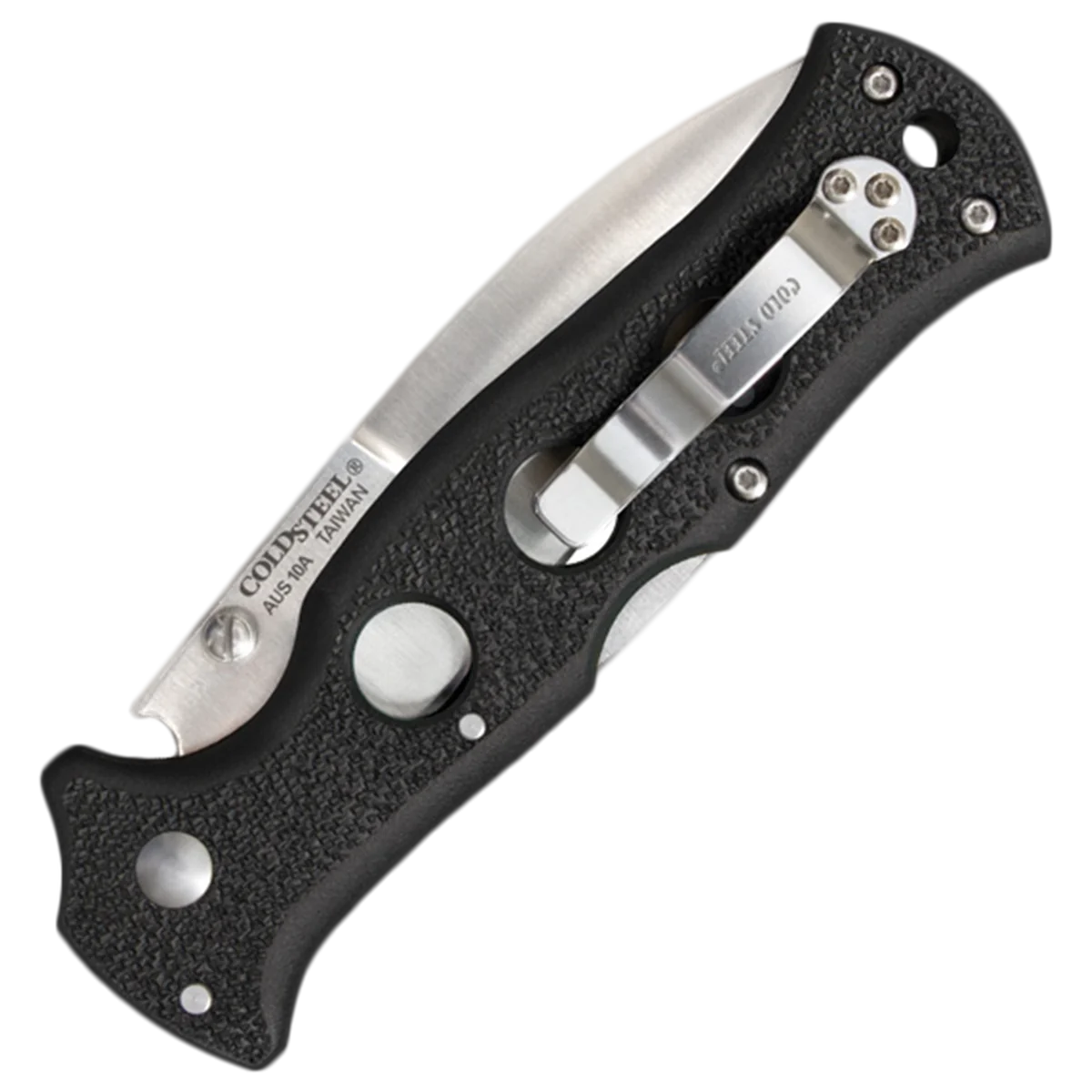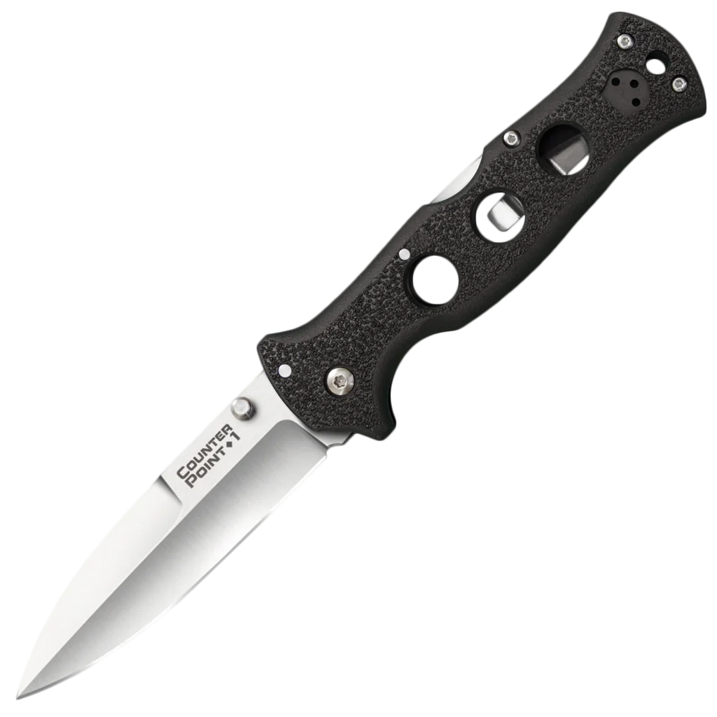 We spent years exploring high-end boot knives, and now we’ve applied that knowledge to a folding knife – the Cold Steel Counter Point. The Counter Point is available in three blade sizes – 3", 4" and 6". Their stiletto-inspired spear point blades have a distinctively pronounced false edge and a lustrous satin finish, combining to make a blade that not only looks great, but delivers a show stopping performance! Made from Japanese AUS10A Steel, the Counter Point is highly corrosion and stain resistant and takes a very sharp and durable edge. The Counter Points handle is made from Griv-Ex and reinforced with heat treated aluminum liners, making it not only very strong, but comfortable and secure in almost any grip imaginable. For added strength and safety, we equipped the Counter Point with our famous Tri-Ad locking mechanism, proven again and again to be incredibly strong and shock resistant.
