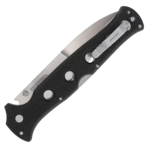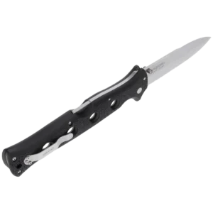 - Folding knife made from AUS 10A stainless Steel, satin finished in a spear point style. Black Griv-Ex handles reinforced heat treated aluminum liners for a solid over all construction! Tri-Ad locking mechanism to ensure a securely locked blade.