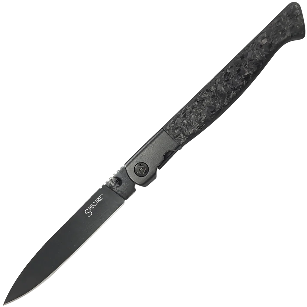 The 60 Series Spectre is available in both Drop Point and Hawkbill blade styles and they are both extremely light with a lean profile that fits the hand exceptionally well, while offering a good solid grip. The Spectre has solid titanium bolsters to give its understructure superior strength. They are a perfect blend of strength and beauty, offering a surprising amount of reach and cutting edge for your daily cutting needs. From its 3.8mm-thick, 20CV steel blade to the edge-retaining hollow grind and eye-catching matte black PVD finish, everything about this knife is sleek and sophisticated. Equipped with convenient thumb stud openers, the Cold Steel Spectre offers an effortless opening experience.