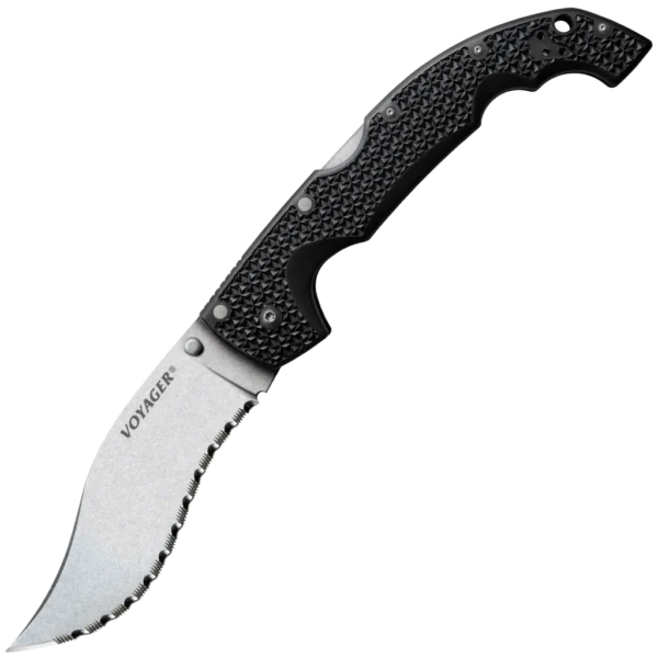 The Cold Steel Voyager series is designed to be the true “everyman” knife. Lightweight, comfortable and super-sharp, they are rugged, dependable and well suited to camping, outdoor and general utility tasks. The Voyagers excel in many survival and rescue applications and are popular with police and military personnel, who appreciate their combination of cutting performance and safety. Each knife in the Voyager series is precision engineered and held to exacting standards. Featuring AUS-10A blades and the Tri-Ad locking mechanism, a secure, safe and shock-resistant lock. The Voyagers' ergonomic Griv-Ex handles (reinforced with heat-treated 6061 aluminium liners) provide comfort and a secure grip even under extended use in tough conditions. Available in two sizes and with numerous blade and edge configurations, there’s a Voyager for everyone