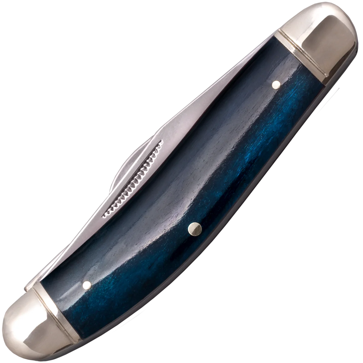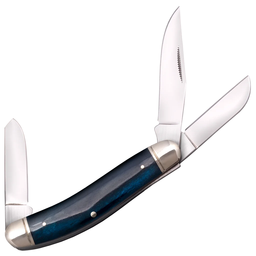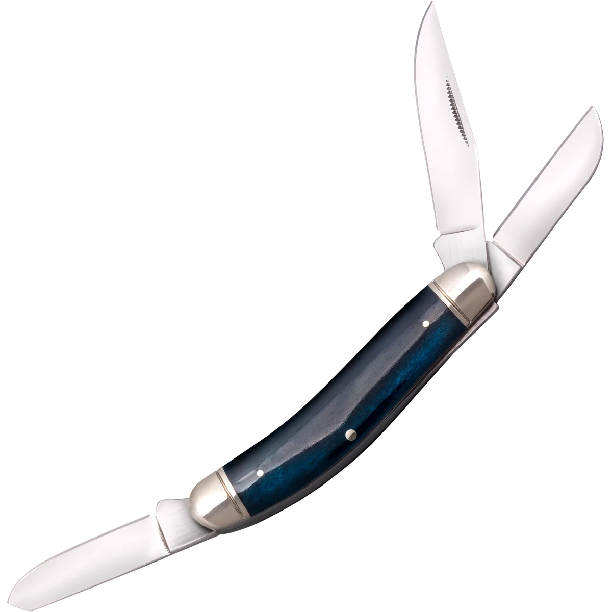 This version with 3 blades, which has been customarily called a Stockman knife, has the standard clip point and spey point blade of the Trapper with the addition of a sheep's foot styled blade. Like the Trapper knives, it's available in three handle styles. Features: Clip point, spey, and sheepsfoot blades. Nail nick openers. Blue bone handle. Non-locking slip joint mechanism.