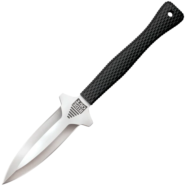 - Fixed double edge blade made from AUS-8A stainless steel with a satin finish in a spear point style. Black textured Kray-Ex handle with a lanyard hole, also comes with a secure-ex sheath steel and steel bead chain lanyard.
