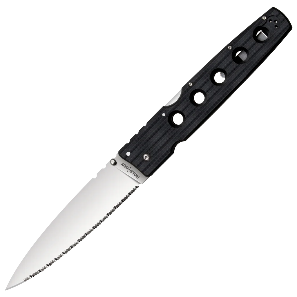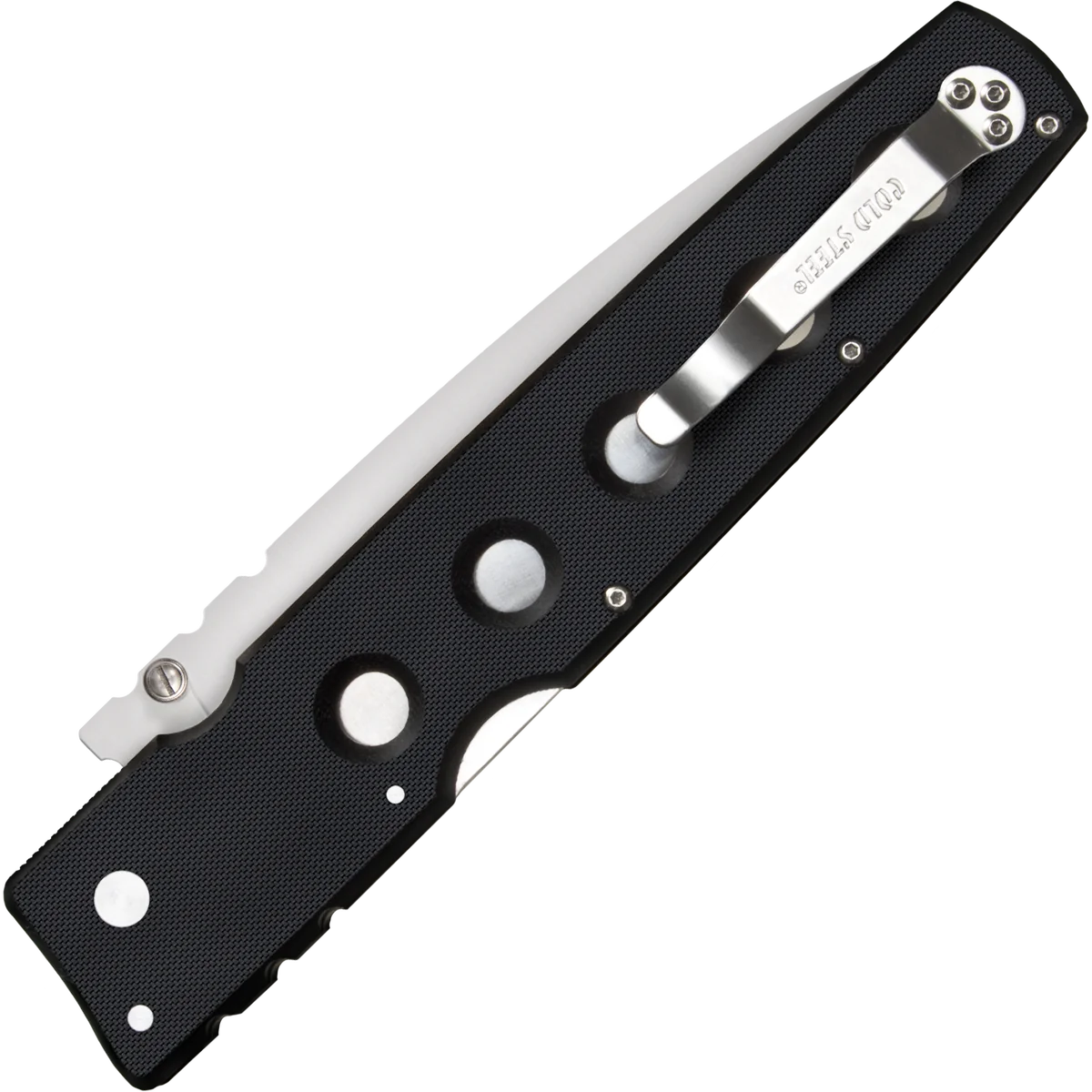 In many ways, the Cold Steel Hold Out series are ideal “EDC” or every day carry knives – providing the comfort that comes from carrying a high quality performance folder but in an astoundingly lightweight and easy to carry package. Their beautiful satin polished S35VN steel blades are extremely functional. They are flat ground from the spine, with a shallow “V” cross-section culminating in a razor sharp hand-honed edge. Continuously curved from the heel to the needle-sharp tip, the blades make short work of daily tasks and cutting chores, around the campsite or in the wildnerness.