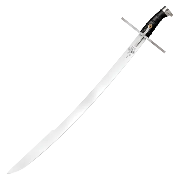 Hungary by virtue of its position on the world map is a country that straddles the cultural influence of both the East and the West. This influence is, of course, directly echoed in Hungarian armaments. The blade of our saber is made from 1055 high carbon steel with a hard spring temper. It has a hatchet point making it wider at the tip or point than at the guard. The guard of our saber has very wide sturdy quillons. The wider quillons offer greater protection to the hand and forearm. The leather scabbard is, in a word, gorgeous. Its fittings are attractively arranged and provide a light, bright contrast to its black leather base.