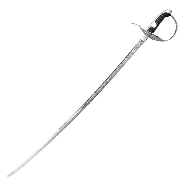 Most military sabers are effective for cutting, but they can be heavy and are challenging to wield with precision for any length of time. The Italian Dueling Saber, however, is different! Its long, slim, moderately curved blade is feather light and you can easily write your name in scarlet with its razor edge. Many years ago, Maestro Ramon Martinez introduced this effective blade to our president, Lynn C. Thompson, and Lynn was impressed enough to want to produce one for Cold Steel. Our Italian Dueling Saber is best described as ornate. The blade, artfully forged, tempered, and polished has an attractive deep scroll etching that is sure to capture your eye, and the intricately pierced guard is made from brightly polished nickel steel. The guard has rolled edges and provides unsurpassed protection for a swordsman’s hand and forearm. The handsome scabbard is made of thick black leather and features a mirror polished and etched throat and chape, with dual carrying rings.