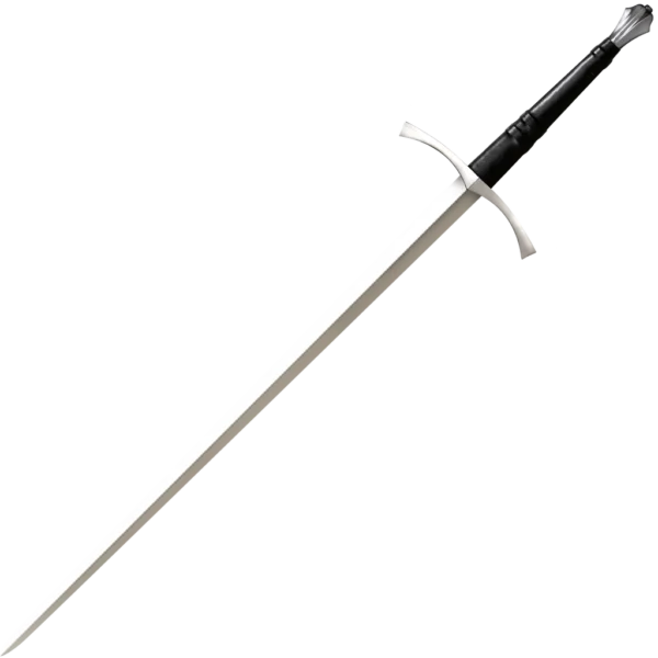 The era of the long sword spanned almost three centuries (approximately 1350 to 1650). This, undoubtedly, was because it really worked! It featured a distinctive cruciform hilt and a long, double edged blade and was equally adept at opposing both light and heavily armored foes. You see, its extra long blade offered the reach and leverage for powerful cutting and chopping strokes while its long cross guard and heavy pommel were useful for hooking, striking and smashing. When heavy plate armor was encountered, blows with the edge were marginally effective and were often abandoned in favor of a "Half-Swording" technique; where one hand grips the hilt and the other the blade to better direct the point in powerful jabs, and to more accurately thrust at the small gaps and joints present in a suit of armor. Having read S.M. Stirling's "Change" series of science fiction novels about a world that loses 600 years of technological evolution overnight (an event called "The Change") at least a dozen times each, has left our President Lynn C. Thompson quite taken with the many virtues of the Long Sword and inspired him to make a Cold Steel variation.