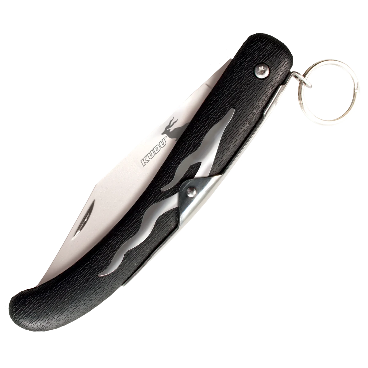 - Cold Steel's Kudu folding knife made from 5Cr15MoV stainless steel, mirror polish finish Clip point blade. Black Zy-Ex handle with built in heavy spring ring lock to help keep the blade securely in place.