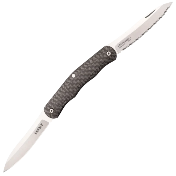 The 54VPN Lucky by Cold Steel is the modern re-invention of the classic gentleman's pen knife. Designed by Lynn C Thompson and Andrew Demko, this exquisite, expertly engineered knife is the ultimate upscale pocket / pen knife. Astonishingly lightweight, barely moving the scale at a meager 1.2 oz., the Lucky is utterly effortless to carry. Carry it in a pocket, or use the removable pocket clip to wear it with dress pants or lightweight summer slacks, carry it in a thin shirt pocket or even use it as a tie clip. It's so thin and light you'll forget you even have a knife – but it's always there when you need it! Made to the highest standards and with the very best materials, the Lucky packs an astonishing amount of capability into one very discreet package. Its twin blades (one plain edge, one serrated) are made from CPM-S35VN stainless steel, hand fitted and securely nestled between two-tone polished carbon fiber scales – and with an RC of 60-61, the Lucky takes a razor edge that will last! The Cold Steel Lucky is destined to become the quintessential gentleman's carry knife. Stylish, unobtrusive, elegant and legal almost everywhere in the world, it's a versatile knife that will serve you well for a lifetime and beyond – and look beautiful doing it!