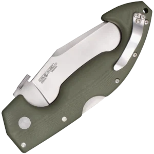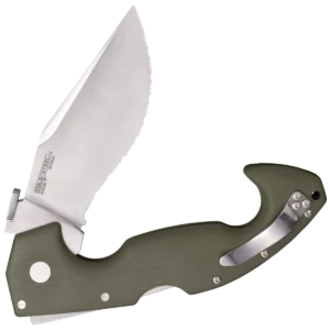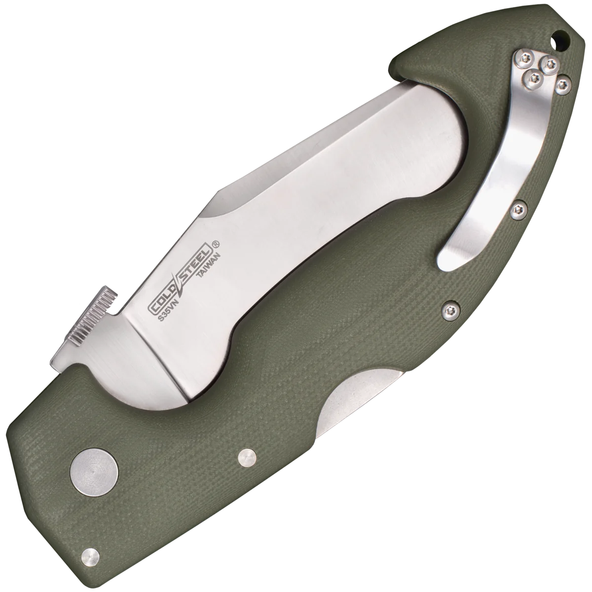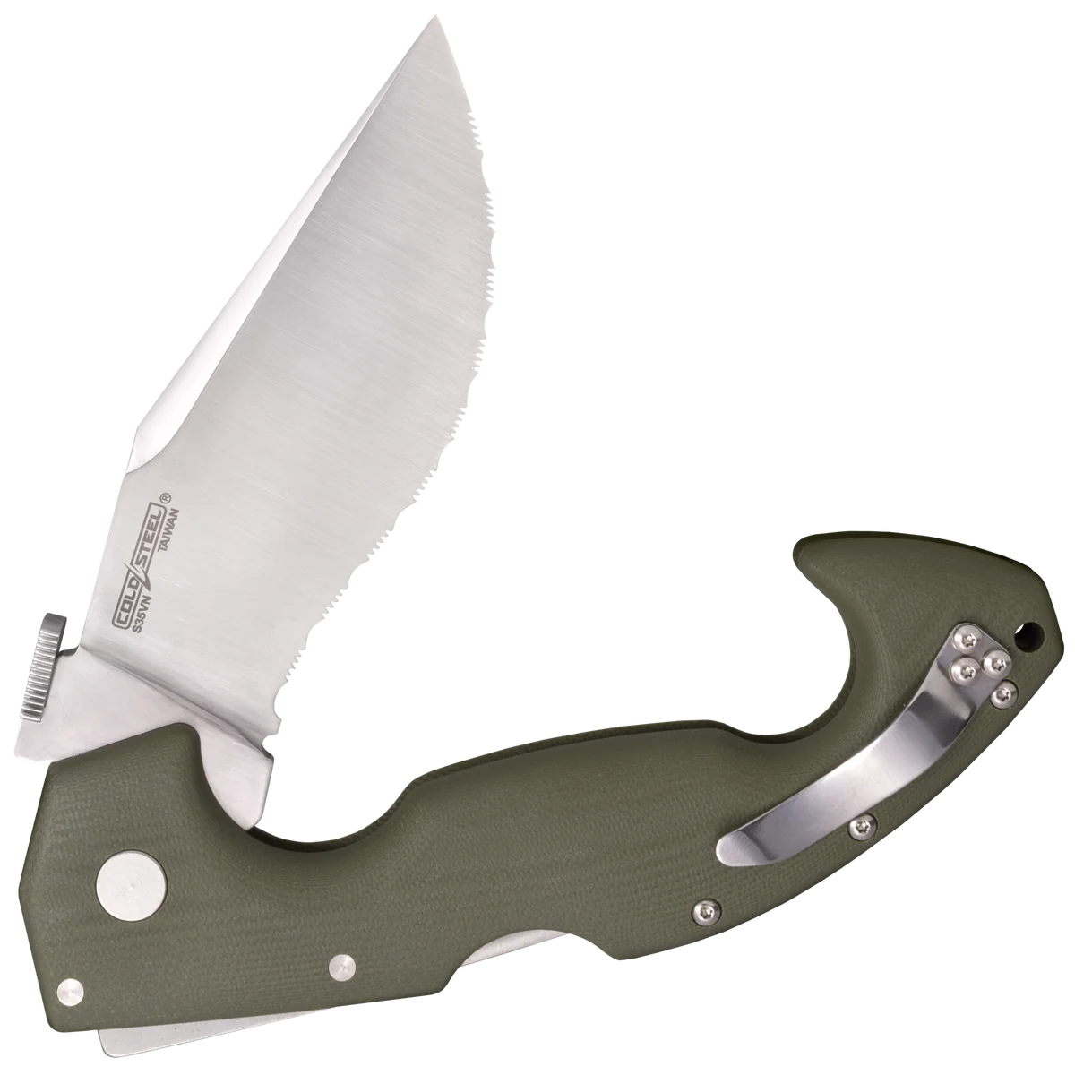 New for 2022 is the Cold Steel Lynn Thompson Signature Spartan, featuring a signature on the front face of the blade and a serial number of authenticity. The Spartans super-sharp serrated blade is made from S35VN Steel, and was designed to echo the aesthetics and cutting performance of the world famous Kukri, with its recurved edge, big belly and sharp point. The blade of this Cold Steel knife has the patented "Demko" thumb plate for ambidextrous one handed opening, as well as open on withdrawal. The grooved OD Green G-10 handle has a pronounced choil and pommel curve for secure grip, steel liners for strength, the Tri-Ad lock and a lanyard hole. It’s heavily contoured for comfort and features irregular fluting and a heavily textured surface finish for an exceptionally effective grip.