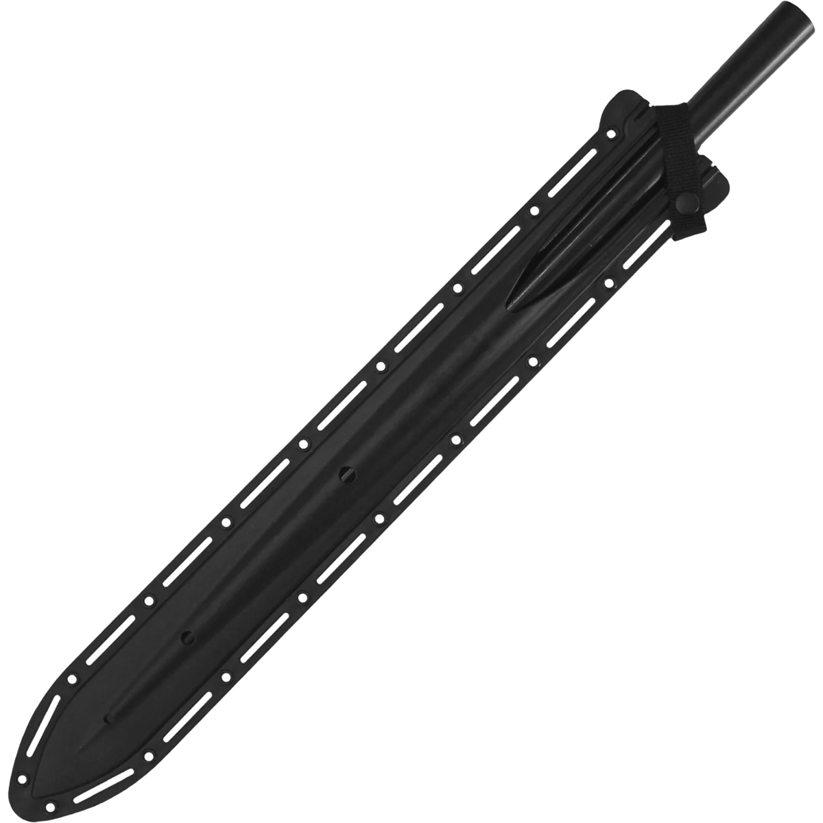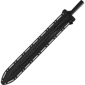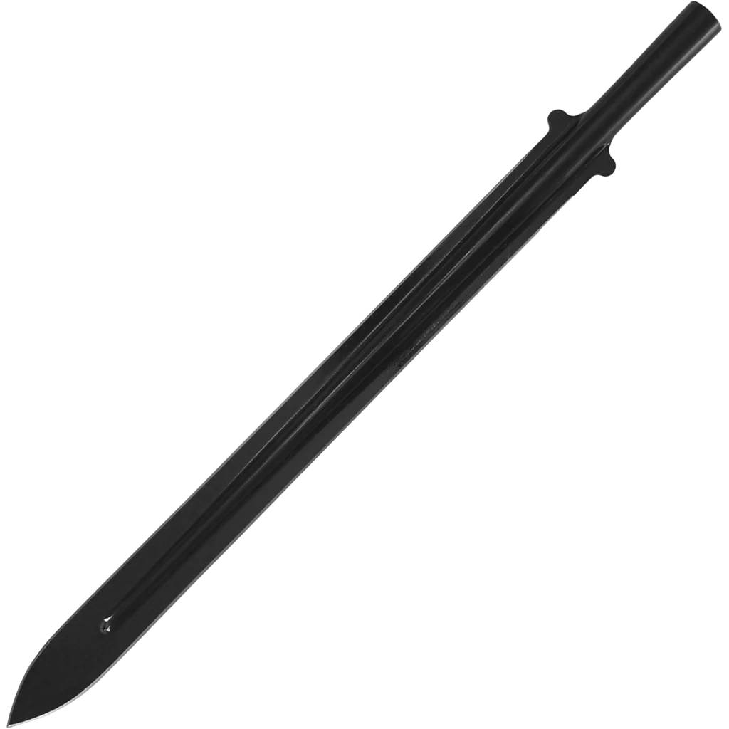 This fabled implement of the mature Maasai Moran or warrior is one of the most distinctive spears in the world with its long, narrow blade, short wooden handle and heavy counterbalancing butt spike or shoe. The spear is a warrior's most precious possession and never leaves his hand except to rest point up in the earth at his side. Each spear is carefully cold-forged from high carbon steel and combined with a stout ash wood handle and sturdy counterbalancing spike. When fully assembled, it measures 6 ft long and weighs 3 lbs 2 ounces! Delivered unassembled, the razor-sharp Maasai spear consists of three parts: First the blade itself measures 22" long by 2" wide and is forged with a thick reinforcing rib that runs down the center almost to the very tip. Second is the brown American ash shaft with a double taper which fits into twin sockets connecting butt and blade. Third is the heavy solid steel butt spike that is also heat-treated to a hard spring temper. The Maasai spear includes an injection-molded sheath to help protect you from unwanted contact with the razor-sharp edge or point.