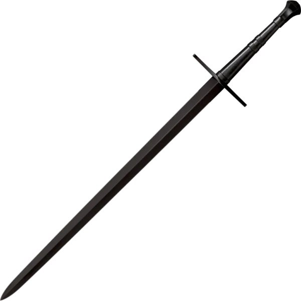 Cold Steel is quickly becoming the go-to company for functional, affordable, reproduction swords and knives. Their stuff is great for reenactors, or folks who just like chopping stuff up in the woods with old style tools! The Man at Arms was a stalwart and dependable man who exhibited great martial prowess. He was capable and competent veteran. Although he was not a Knight, he went and trained alongside them as a brother in arms. To honor these rugged, reliable, salt-of-the-earth warriors Cold Steel has created a range of true journeyman’s tools that they have called the Man at Arms Collection. These practical swords lack the gleaming blades and polished silver steelwork of their other swords, but they pack a resounding punch where it counts! Approximating the quality and performance of these high end swords, the Man at Arms collection features a selection of some of the finest high performance blades but at a markedly reduced price. Their fully sharpened and blued blades have a distinctive gun metal finish that compliments their black leather handles, and when well-oiled they are gleamingly beautiful in their own right. If you always wanted a Cold Steel sword, but couldn't afford one, the Man at Arms collection is for you. This is a well executed, high value version of the CS88GMS Grosse Messer Sword with a blued steel blade.