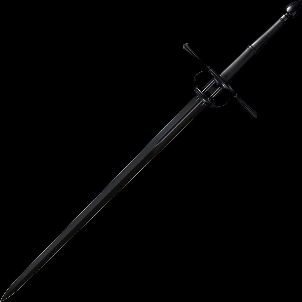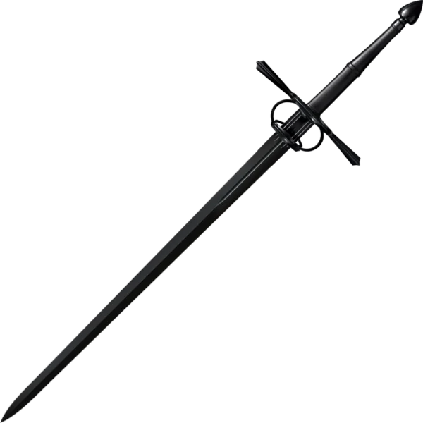 Designed by noted swordsman Luke LaFontaine and bearing his name, Not carried on a belt or baldric, rather it was held in hand, rested on the shoulder or simply carried by a manservant or page. It was almost as big as a Zweihander or a Great Sword; with a long double edged blade, elaborate ring guards, counter guards and peaked quillons, a closed ricasso for looping a finger through the cross for added control, and a heavy counter-balancing pommel. A versatile and complex weapon with many advantages that should be apparent to any historical European martial artist, it was also a symbol of prestige that said much about the status and prowess of its wielder. Made in Cold Steel's signature "Man at Arms" style, the LaFontaine Sword of War features a 1055 carbon steel blade that has been deeply blued to an inky black sheen. The LaFontaine Sword is fully sharpened and supplied complete with a thick leather and steel scabbard.