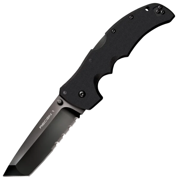- Folding part serrated knife made from S35VN stainless steel with a DLC coating in a tanto style. Black textured G10 handles with a reversible pocket clip and lanyard hole, uses cold steel's tri-ad locking mechanism.