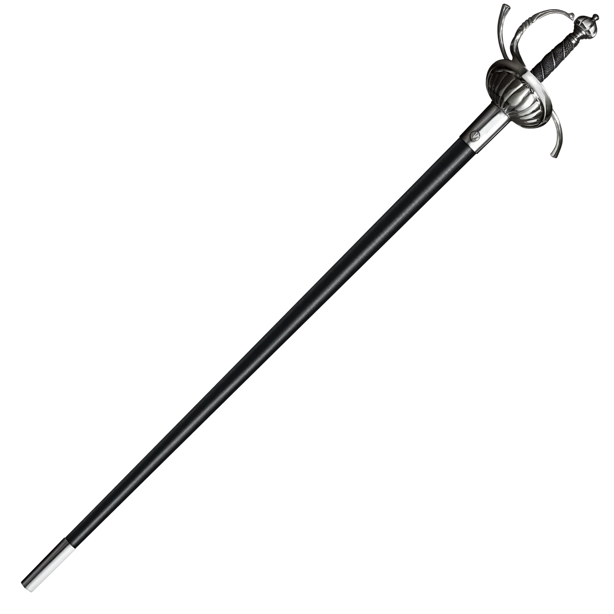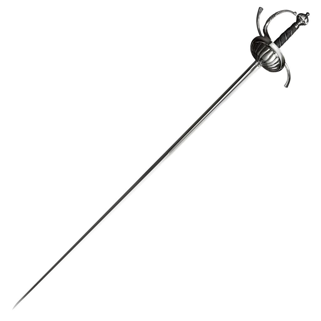 Its long, double-edged blade was ideal for delivering the point at great distances. Its elaborate hilt (evolving from rings, bars and quillons, to shells, and chiseled cups) offered excellent protection and caught or deflected blows with ease. Sadly, the rapier eventually succumbed to the dictates of fashion and gave way to smaller swords. Our modern interpretation of this historical classic has a long, narrow blade with a single wide fuller to assure perfect balance. Its hilt features a classic ribbed shell and multiple bars, quillons and a knuckle bow for hand protection. The grip is made of wood covered with rich black ray skin and wire and terminates in a heavy ribbed pommel that serves as a perfect counter balance to our Rapier's blade.