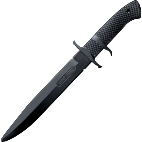 The Black Bear Classic Rubber Trainer, from Cold Steel knives, is a training version of the Black Bear Classic Cold Steel knife that has been fashioned to look as realistic as possible: for effective use in practice, training drills, disarming drills, and demonstrations. The 8 1/8" Santoprene rubber blade is soft enough to prevent most injuries to the body, but has a level of firmness that could cause injury to the face or the eyes. The use of appropriate eye and face protection is recommended. The Santoprene handle is deeply checkered for sure grip, and has a lanyard hole. The overall length of the Cold Steel Black Bear Classic rubber training knife is 13 1/8", and it weighs in at 3.4 ounces.