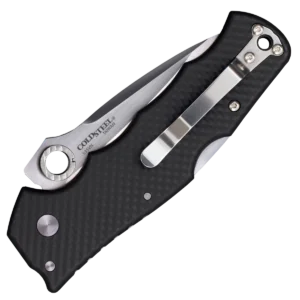 The Silver Eye has a spear point blade and a carbon fiber Handle. The Cold Steel Silver Eye offers a high performance folder with a sophisticated design from custom knife-maker Andrew Demko. It has a hand-honed razor sharp blade made from S35VN steel with a plain edge. The handle is constructed from beautiful carbon fiber scales and Cold Steel's reliable Tri-Ad locking system. Brass details on the pocket clip and thumb hole opener further add to the aesthetic appeal of this knife. This model is fully ambidextrous with a reversible pocket clip and a thumb hole opener. Get high performance craftsmanship and collectible style with the Cold Steel Silver Eye.