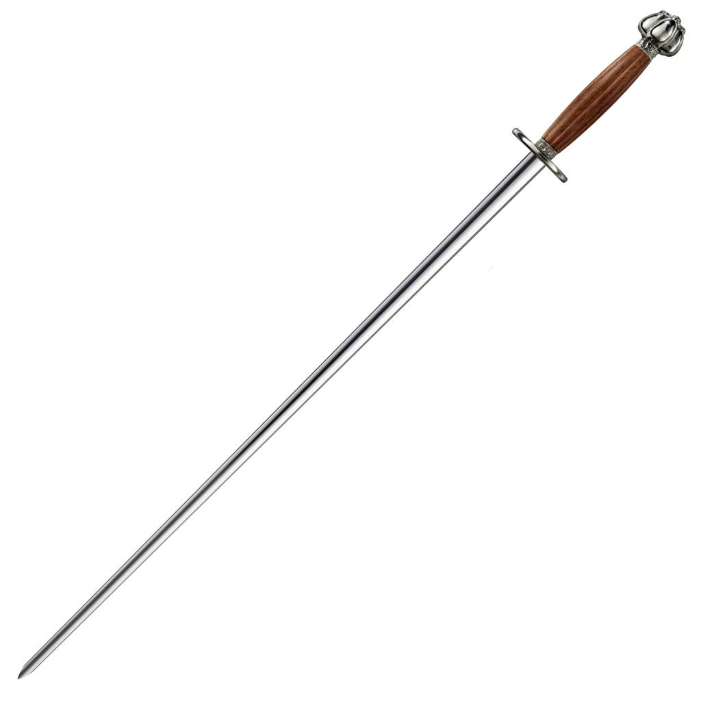 Cold Steel drew inspiration for this design from an original antique Sword Breaker they were privileged to handle and study in China. The handle is made of heavy, dense Rosewood with a fluted cross section that affords a good grip. It features beautifully cast nickel-silver fittings throughout, from the decoratively detailed circular guard to the very stout 5 lobbed pommel that effectively counter balances the weight of the blade and makes it easier to wield. Thirty inches long and beautifully forged out of 1050 high carbon steel, the Sword Breaker has a striking rectangular cross section and hollow ground "flats", and comes compete with a Rosewood scabbard that features nickel-silver furniture to match the grip.