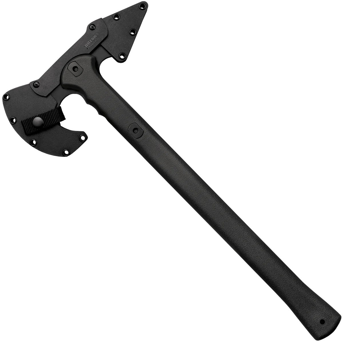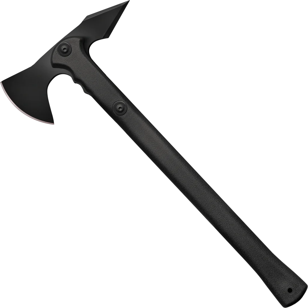 The Cold Steel Trench Hawk features a sharp cutting edge and wedge-style spike, offering numerous application options.. Drop forged from 1055 carbon steel and differentially hardened, the head of the Trench Hawk will withstand tremendous blows as well as the awful stress of prolonged hard use.The handle of our Trench Hawk is highly resistant to shock and will withstand abuse that would break even a tough hickory handle. And, as an added benefit, is easily and cheaply replaced when finally worn out from repeated throwing.*The Trench Hawk comes complete with a patented articulated Secure-Ex sheath. NOTE: any handle can, and will, break eventually.