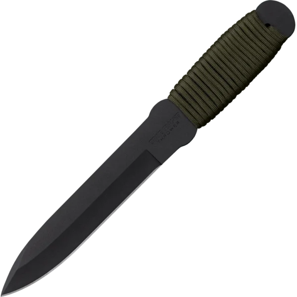 - One piece throwing knife made from 1055 carbon steel, powder coat finish with a utility style blade. Brown paracord wrapped handle with included cordura sheath for transportation.