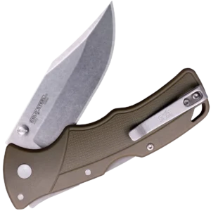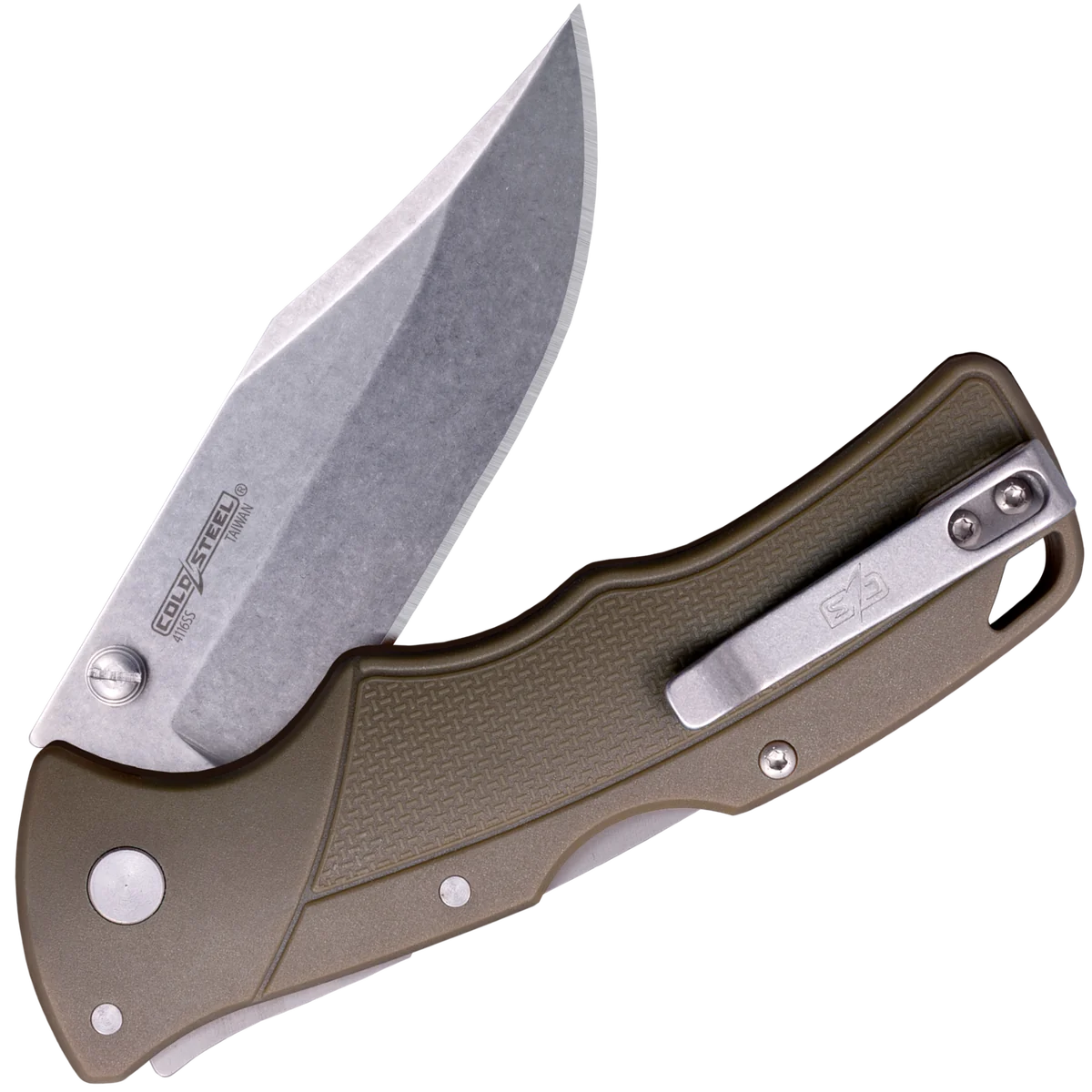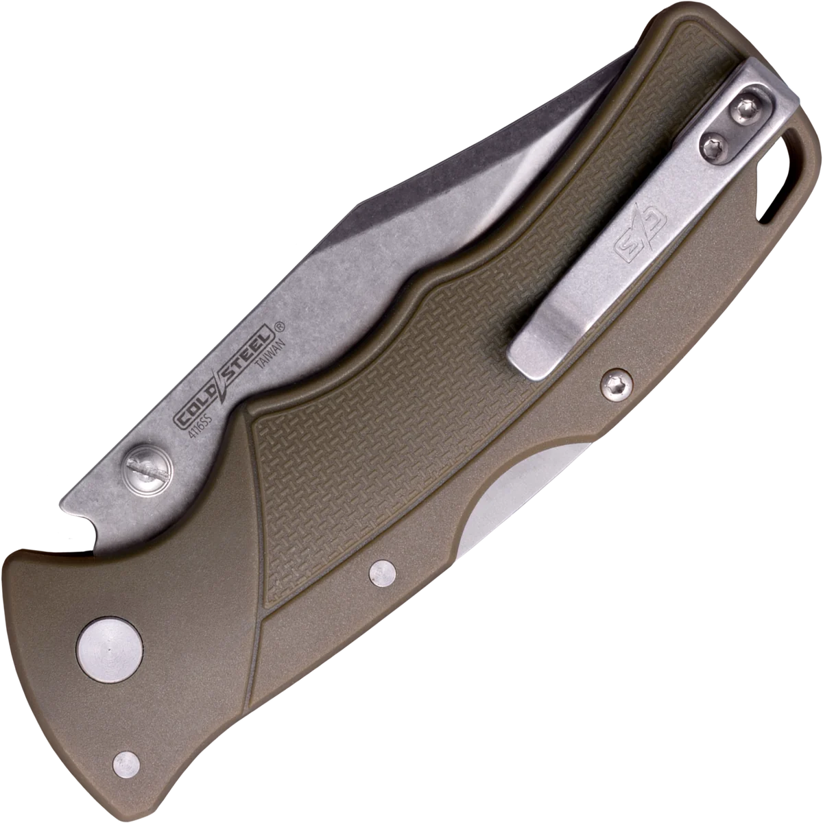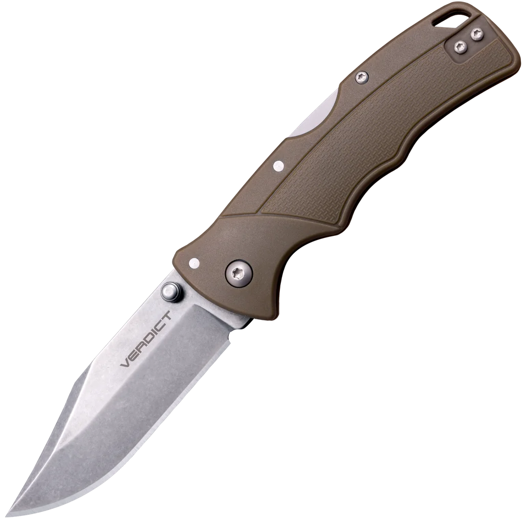 Available in a range of colours and blade styles, the Verdict range utilises sturdy 4116 Stainless Steel and texturised Glass Filled Nylon handles, topped off with Cold Steels famous Tri-Ad Lock! This model features a 3" Clip Point blade in a stonewash finish for a rugged look. The handle is constructed from "Flat Dark Earth" GFN, with a textured finish, and contouring on the handle guides the hand into place for a superior grip that won't let you down, even in wet conditions. The knife is finished with an ambidextrous thumb stud for quick and easy deployment and a steel pocket clip.