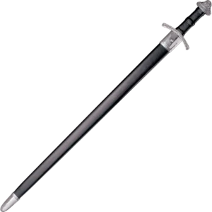 The typical Viking sword of the 9th and 10th centuries featured a long wide blade with a broad central fuller and two keen edges. The preferred stroke was a hard slash or chopping blow. A simple guard with forward curving quillions was often utilized and combined with an equally utilitarian wooden handle that was covered with leather, bone, or even cast in brass. What really made the Viking Sword so distinctively recognizable from its contemporaries was its heavy 5 lobed pommel used to balance the long blade. Our sword has features in common with its historical counterpart. It has a double edged blade, hand forged out of high carbon steel and then polished to a brilliant lustre. The wooden handle is covered in leather and is supported by a simple, elegant guard at one end and an equally handsome 5 lobed pommel at the other. Both guard and pommel feature traditional Celtic knot embellishments. To house the keen double edge blade each of our swords is supplied with a wood scabbard covered in black leather and reinforced with a highly polished steel chape and throat.