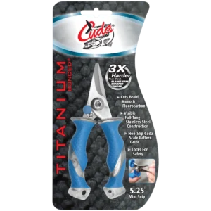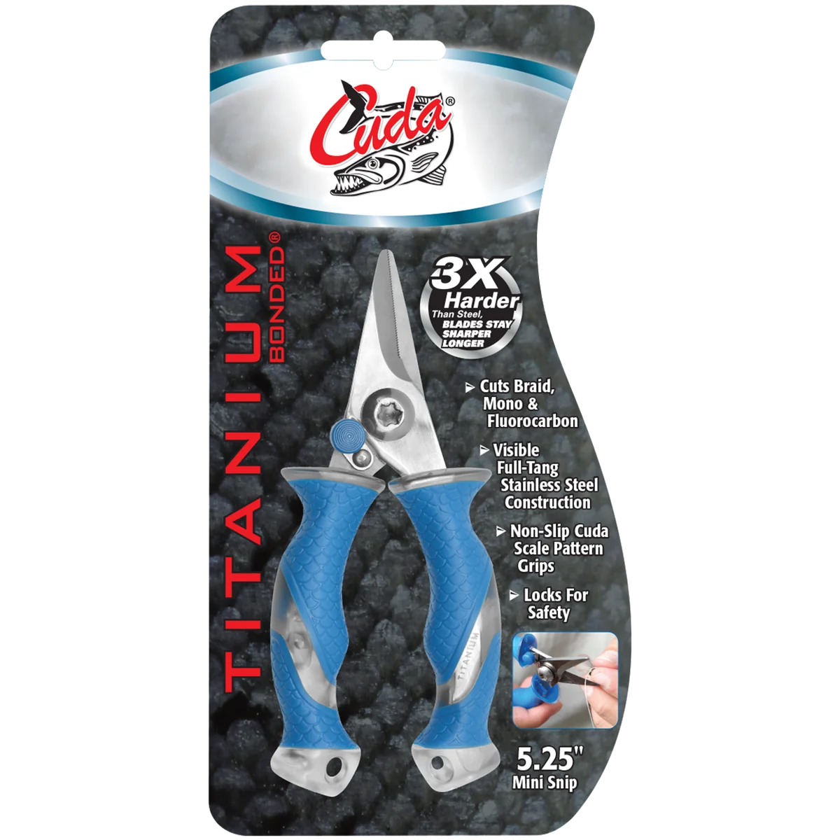 The Cuda 5.25" Mini Snip is one of Cuda's most well-rounded tools when it comes to portability, durability, and strength. The blades are constructed of titanium bonded stainless steel, making them 3x harder than untreated steel to provide exceptional edge retention and an incredible resistance to corrosion and rust. The blades also feature a micro-serrated edge to make cutting fishing line, rope, netting, fins, braid, mono, and fluorocarbon wires a breeze. Beyond the blades, an internal spring system can be found for enhanced cutting performance along with a safety lock for secure storage when not in use. Complete with a full-tang construction visible through the sturdy, Cuda scale pattern non-slip grips, the 5.25" Mini Snip will elevate any angler's performance capacity.