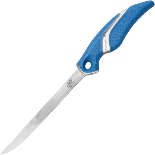 A great size knife for filleting freshwater fish. The blade is Titanium Bonded German 4116 stainless steel so it offers increased corrosion resistance and a sharp edge that will last. The full tang construction is visible through the handle so you know it's durable and the Cuda scale pattern design handle is non-slip for more control. Includes a lightweight sheath with reversible belt loop so it can be worn on either side and a drainage hole to keep your knife dry