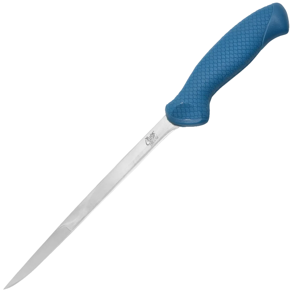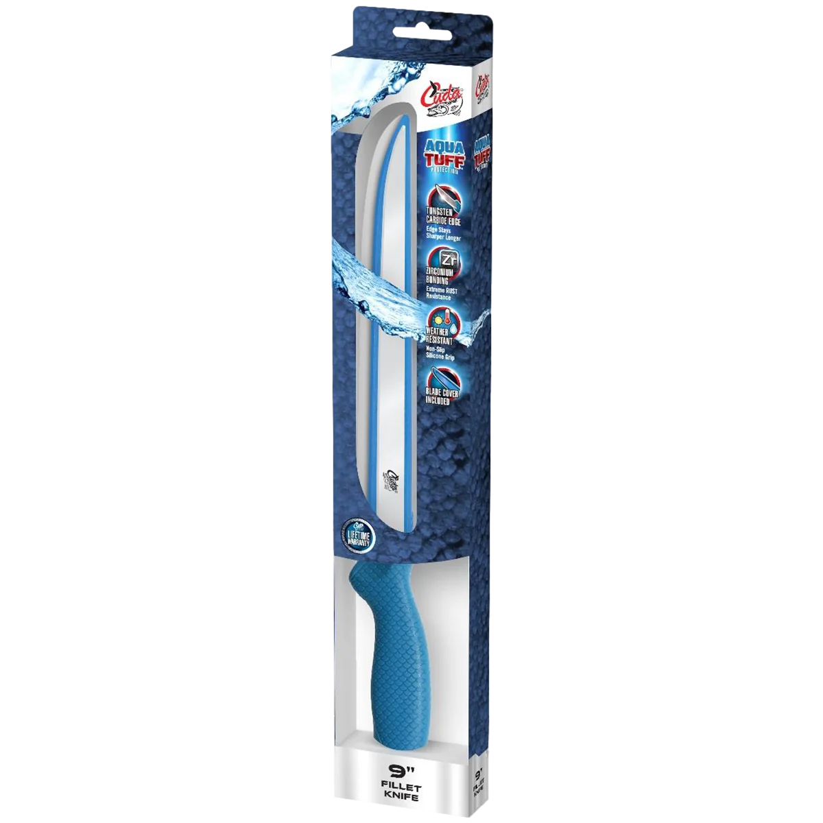 AquaTuff by Cuda is a knife line that offers the very best in edge retention and corrosion-resistance. The zirconium bonded blade provides excellent rust protection and the carbide edge gives the blade extra long-lasting sharpness. With a silicone handle that is weather-resistant and a non-slip secure grip. This 9" fillet knife features a flexible blade that is perfect for filleting larger fish. Includes a lightweight blade cover for protection and safe storage.
