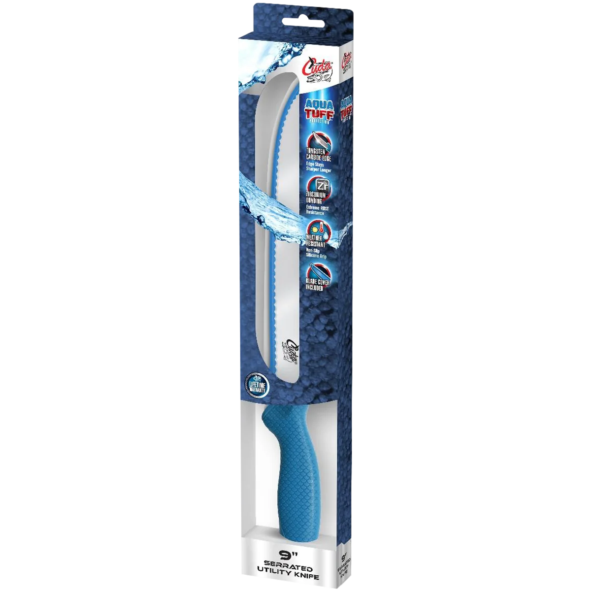 - This 9" utility knife features a serrated blade that is perfect cutting tough fish or frozen bait.
