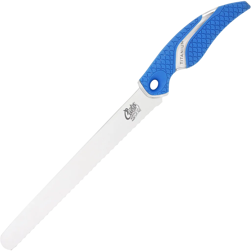 Perfect for tough cuts, chunking and frozen bait! The Cuda 9" Chunk Knife features a precision serrated edge and a non-slip Cuda scale pattern handle through which the full tang construction can be seen. Blade is Titanium Bonded 4116 corrosion resistant German Stainless Steel.